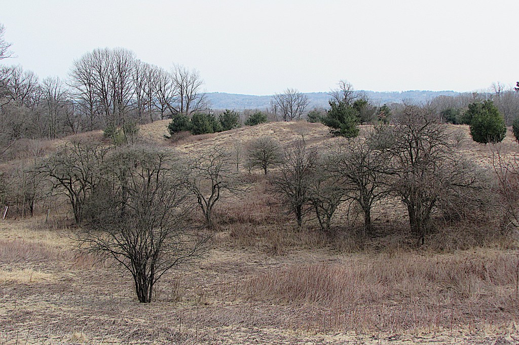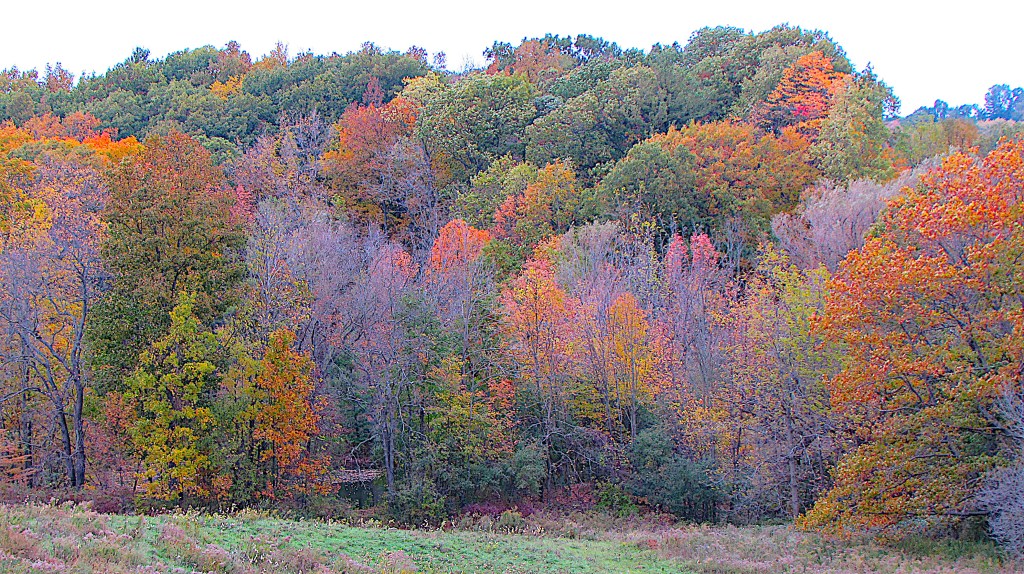 233. You rejoin the Bruce/McCormack Trail and briefly head north, before turning west (left) just before the boardwalk at #224 above. You climb through a beautiful forest, then emerge into an open area of rolling hills. This is the view in the fall over the forest you have just come through …