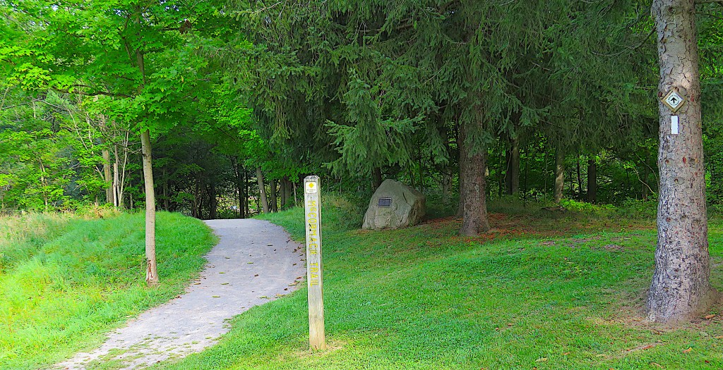 216. This is the start of the hike near the DVCA Trail Centre. On the tree at right is the “straight ahead” white Bruce Trail blaze. The waymark post at centre says “McCormack Trail,” which shares the Bruce from this point. Today’s return loop features more of this trail. I have been unable to find out who McCormack was. The plaque on the boulder at back is dedicated to Agnes G. McCulloch, “in memory of her many years of service 1964-1978 to the Iroquoia Bruce Trail Club.” Aside from this, information about McCulloch is scanty. Dear Hamilton Conservation Authority and Bruce Trail Conservancy: Please provide some biographical information about McCormack and McCulloch, so we have a fuller appreciation of those responsible for the legacy of wonderful trails in the Dundas Valley.