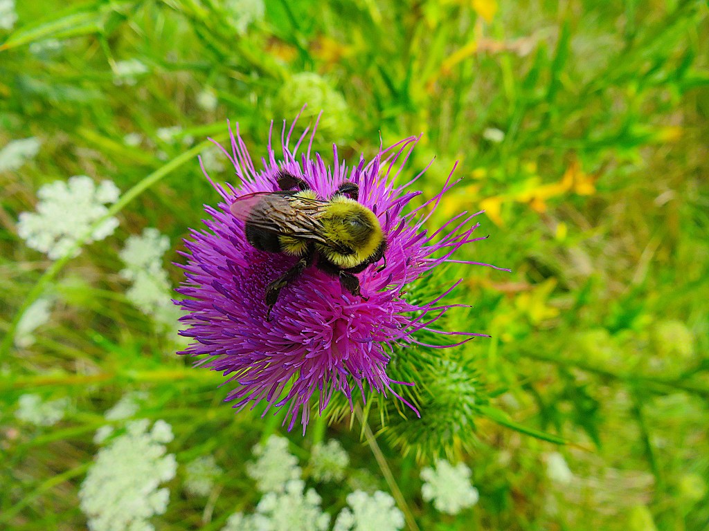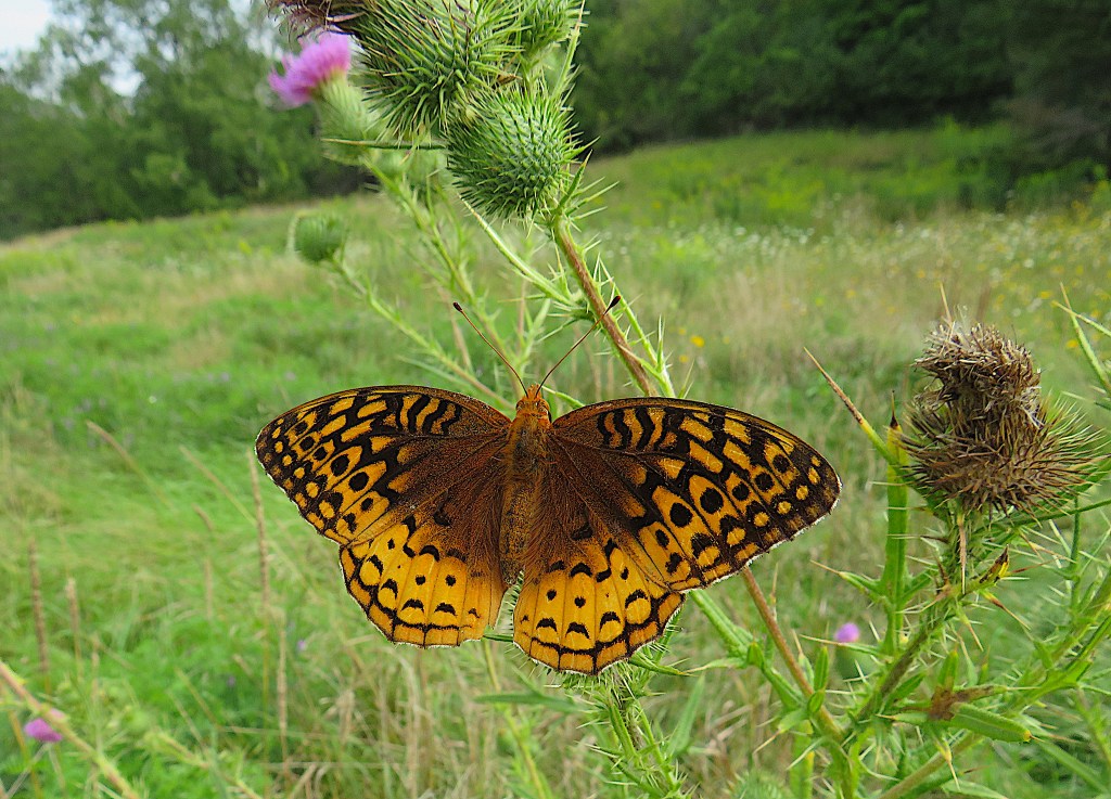 237. There are bull thistles blooming in the field at the entrance of the DVCA, with insects on them happily prepared to pose for the camera. (We’re back in summer, not great for landscape photography certainly, but the best season for entomological close-ups.) The brown butterfly is a great spangled fritillary (Speyeria cybele), while the bee is … totally into that thistle.