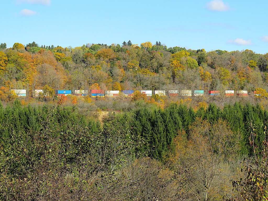 228. To the north of the viewpoint, a freight train at least a kilometre long trundles eastward along the side of the Escarpment. The train, headed for either Toronto or Hamilton, is on the double-tracked CN Dundas Subdivision between London and Burlington Heights. This line was originally constructed by the Great Western Railway in 1853. Dundas itself had a passenger station on it from 1864, and was later served by VIA Rail until 1984, when the station was destroyed by fire and never replaced. No trains, freight or passenger, stop in Dundas any longer.