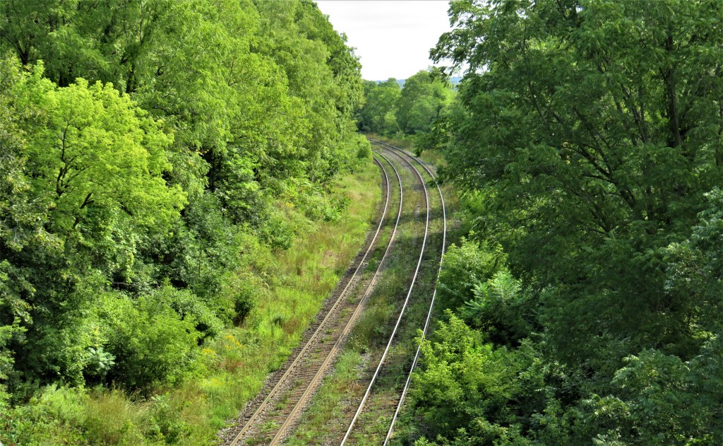 268. Having crossed the road very carefully, take the segregated sidewalk on the right for the short stretch over the CN railroad lines. The sidewalk (top, looking south) was the result of the 1971 construction of the Cameron Dyment Bridge over the CN tracks (bottom). Presumably there were once plans to extend the sidewalk the whole length of the Sydenham hill, but this never happened. An opportunity lost to display the beauty of the Dundas Valley safely and accessibly to everyone, without the need to burn fossil fuel!