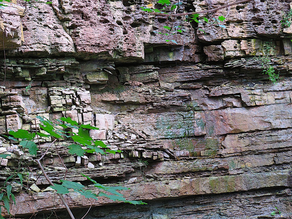 284. Towards the end of today’s hike, there’s a viewpoint to the east with three information placards. They note that the Niagara Escarpment is an International Biosphere Reserve that ranks with the Florida Everglades and Galápagos Islands in global importance. Rock Chapel, having narrowly escaped the attentions of the quarrying industry, has been a protected nature sanctuary since 1942. The placards also explain how the Escarpment was formed, starting with sand and shale sediment from a gigantic river delta that then lay at the Earth’s equator. The Escarpment later served as the rim of the prehistoric Michigan Basin, filled with a shallow sea whose marine creatures, dying, formed a harder layer of partly organic sediment on top of the softer inorganic shales beneath. This Basin was subsequently uplifted by tectonic forces, causing the sea to drain away and leave the exposed cliff. Erosion by wind and water and by several more recent glaciations have caused the softer lower layers to crumble, undermining the hard cap. This geological process continues implacably, so that the scarp face retreats over time, and does so particularly quickly around waterfalls, as here near Dyment’s and Borer’s Falls. (This is why you don’t really want to build your house on the edge … or near the foot, for that matter!)