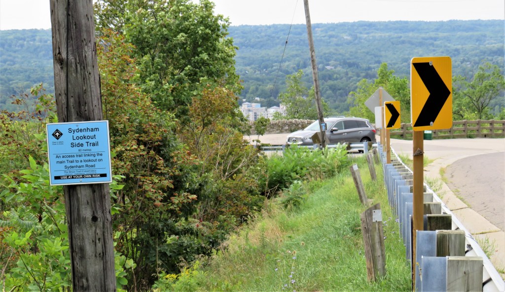 274. At the top there’s the sign indicating the 80 metre Side Trail to the Sydenham Lookout. It’s so short that it doesn’t really count as a side trip. The parking lot is busy at all times of the year …