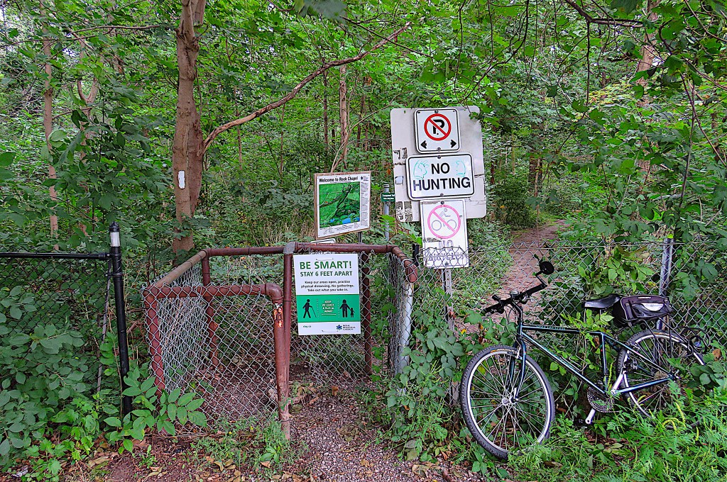 277. At the end of Romar Drive, this kissing gate, plastered with the usual warning notices, gives access to Rock Chapel Conservation Area. There’s no cycling allowed anywhere on the Bruce Trail.