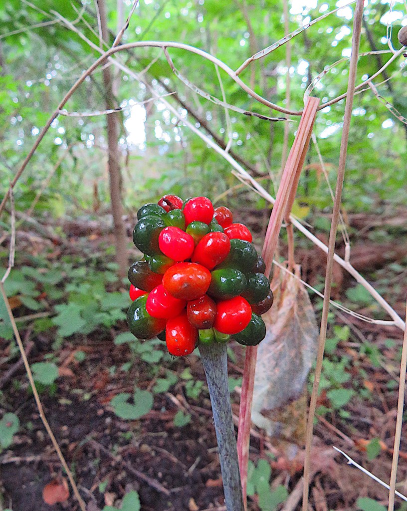 278. You may have seen an isolated tight cluster of berries on the top of a stalk (technically, a spike or spadix) close to the ground in the woods. They are the fruit of the Jack-in-the-pulpit (Arisaema triphyllum), a native plant in the arum family. Now in late August the green berries are turning a brilliant red. Gone are the flower (the spathe, or “pulpit”) that formerly curved like a hood over the spadix (the spike, or “Jack”). All parts of this plant are poisonous to humans, though birds and mammals eat them.