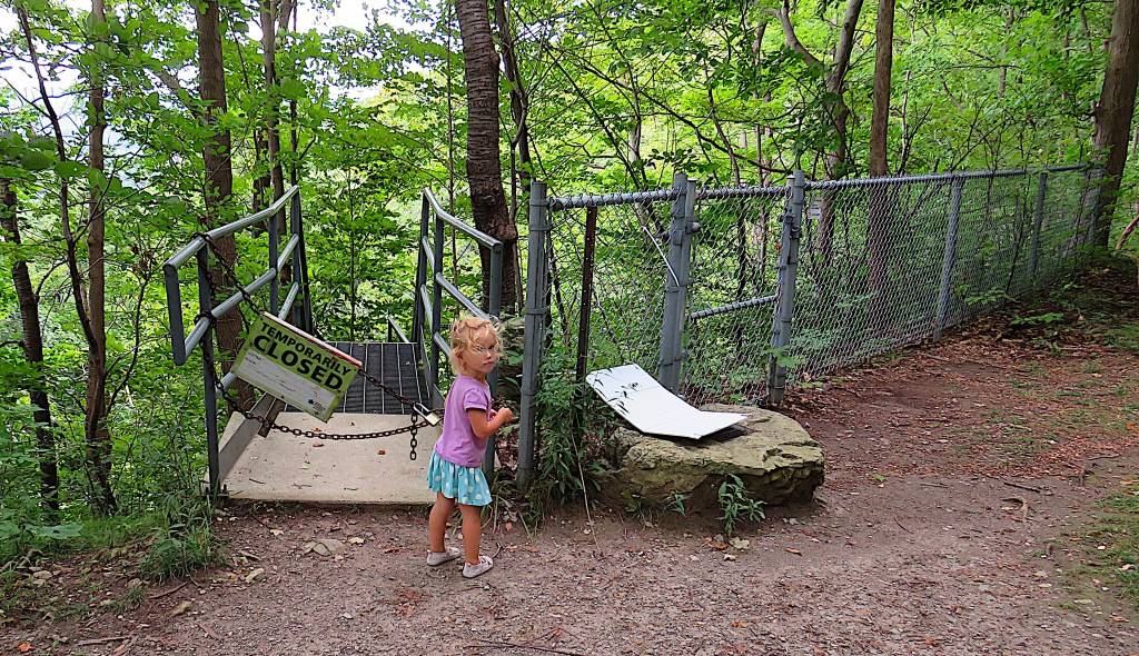 280. This little one seems disappointed that the Armstrong Trail staircase is closed during the pandemic. But it’s true that social distancing would be difficult on it.