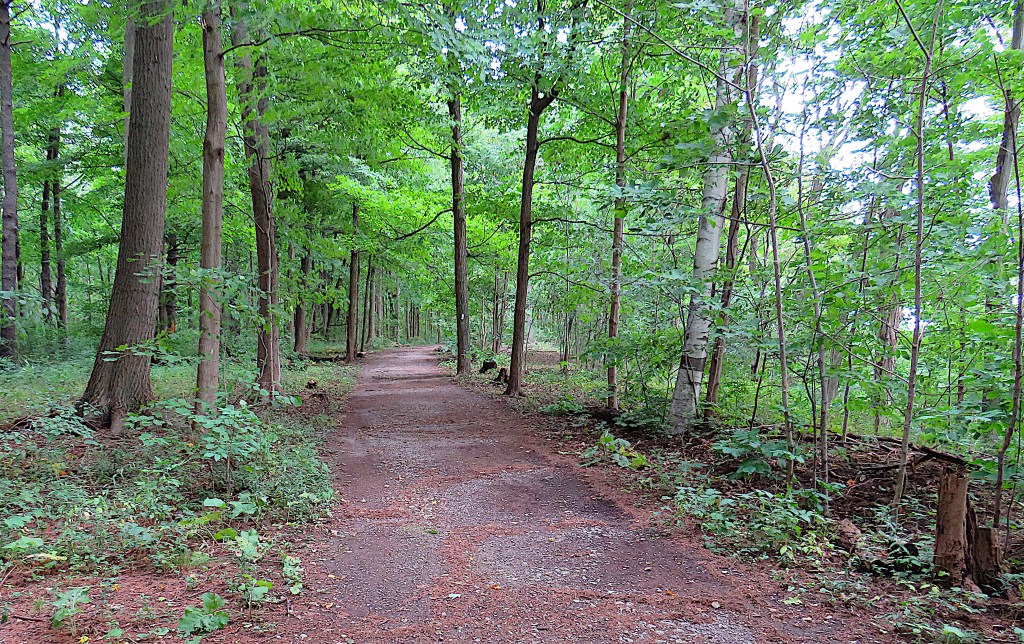 At the end of Romar Drive, you enter the Conservation Area, and have a delightful stroll through woods along the edge of the Escarpment. The Trail here becomes so broad, level, and well-drained that you can do it comfortably in almost any weather. If you are at all interested in Escarpment geology, watch for a sign for the Armstrong Trail and a steel staircase descending steeply over the edge. (This is likely to be closed during pandemic lockdowns.)