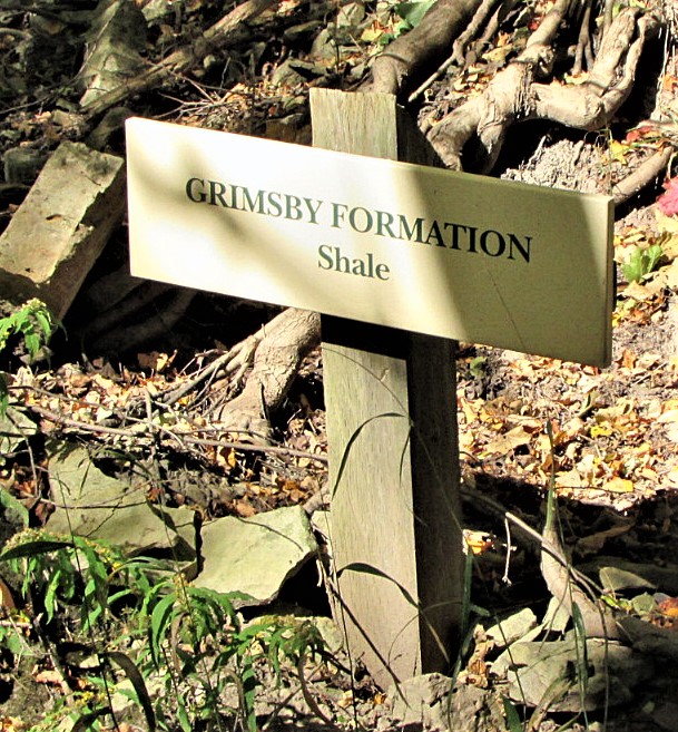 281. This is what the 10-metre-long stairs look like when it’s open. As you descend it, there are signs indicating the name and composition of the six geological strata of the Escarpment visible here. The Lockport Formation (Silurian) is the relatively hard dolomite that forms its most “recent” top layer or cap. Dolomite is limestone hardened by contact with magnesium, possibly through microbial action under greenhouse conditions. Under it lie the following Formations, in order of descent: the Rochester (Silurian: grey shale); Irondequoit (Silurian: dolomite); Reynales (Silurian: dolomite); Thorold (Silurian: sandstone and grey shale); and Grimsby (Silurian: red shale and sandstone). The Escarpment’s lowest and oldest layers, from the Cabot Head (Silurian: shale) through the Queenston Formations (Ordovician: red and grey shale), are not visible here as they are buried under a talus slope.