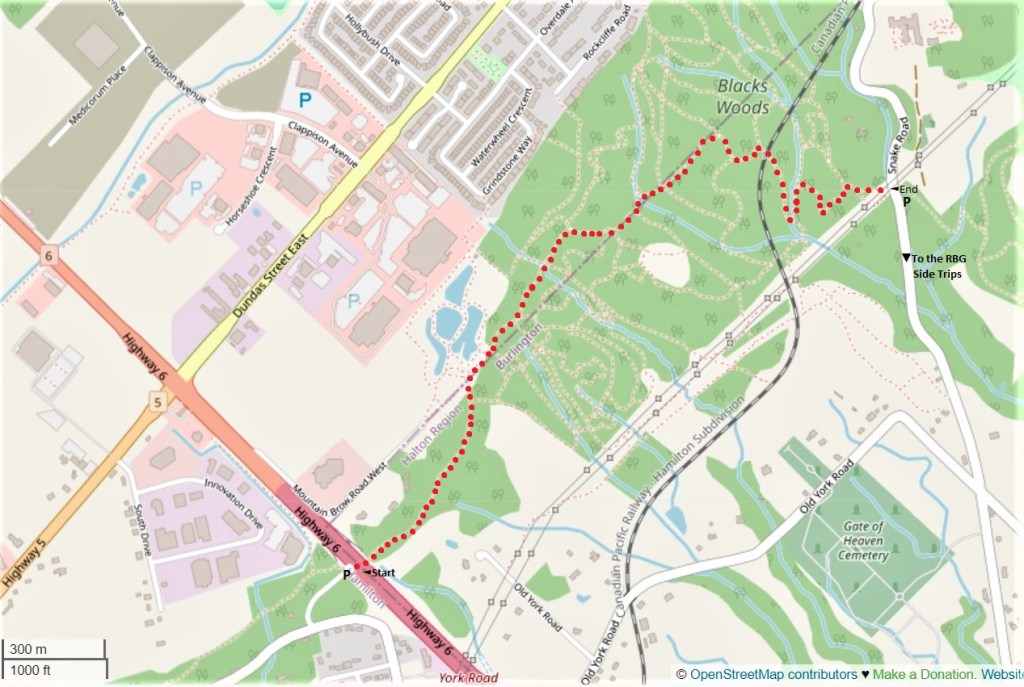 It’s possible to walk either along Plains Road West or via off-road trails between these three RBG sites. A Burlington Transit bus (#1 Plains) runs along Plains Road between Appleby GO Station and downtown Hamilton, linking all three RBG sites. This bus does not, however, offer effective transportation to either end of Hike #15.