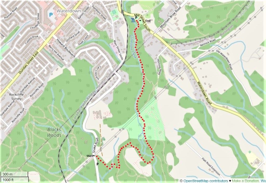 329. Today’s hike is 3.4 km one way. With two cars, park your start car at the side of Snake Road as on the previous hike. Park your end car in the small free P at Smokey Hollow on Mill Street South in Waterdown. Note: parking is very limited at this popular spot (see #340 below). If the Smokey Hollow lot is full (as it almost certainly will be on weekends), you’ll have to park your end car somewhere in Waterdown Village and walk up Mill Street South from the end of the hike to reach it. Be careful to face oncoming traffic as you do so, as there is no adequate sidewalk where Mill Street narrows under the rail bridge.