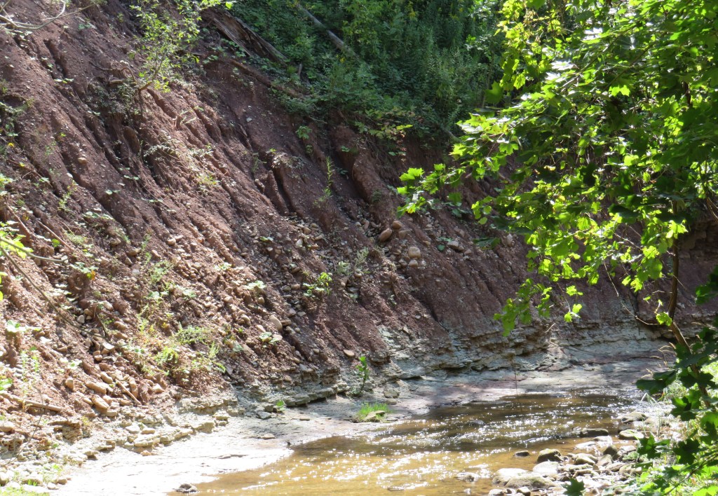 333. This steep bank, downstream from the bridge above, is constituted of Queenston shale, whose reddish colour is due to the presence of iron (in the form of hematite). In this area the red shale was once quarried for brick-making (see #117 above). Queenston shale consistently forms the lowest level of the Niagara Escarpment. It’s the remnant of a gigantic muddy river delta formed about 420 million years ago. The shale lines the shore of Lake Ontario between Hamilton and St. Catherines. Its best-known local exposure is in the Cheltenham Badlands in Caledon about 63 km north of here.
