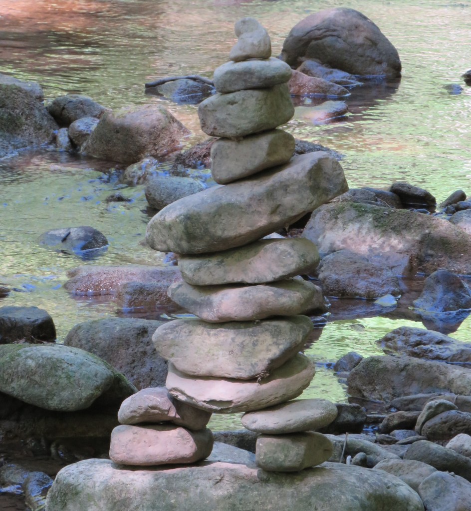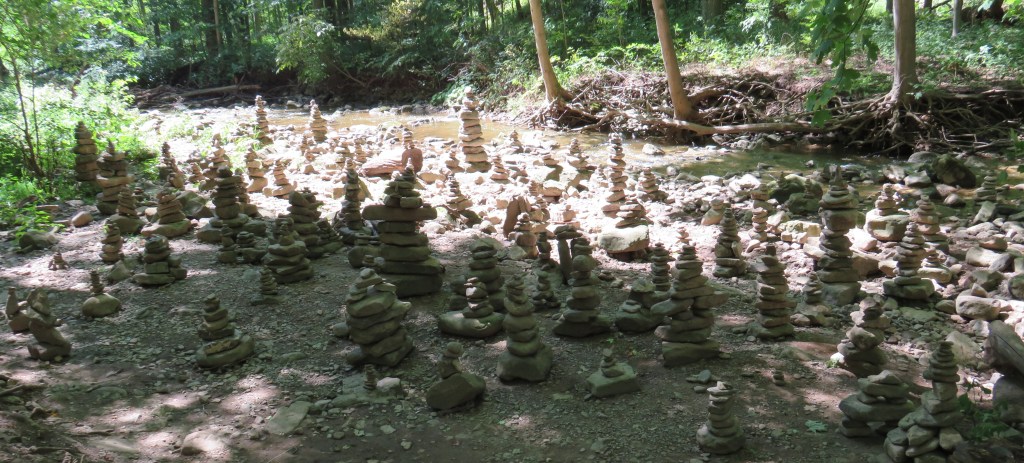 335. Farther upstream, there’s an extraordinary creekside installation. A traditional inukshuk (plural inuksuit) is a pile or cairn of flattish stones constructed as part of Inuit culture. The word comes from the Inuktitut language (ᐃᓄᒃᓱᒃ) and means something like, “that which acts in the capacity of a human.” In the Arctic they have been built for generations, often as signposts for hunters, navigational aids, or pointers to sacred sites, and take a variety of forms depending on the message they communicate. The one in the lower image resembles a human figure, for which there is a special word, inunnguaq, meaning “in the likeness of a human.”