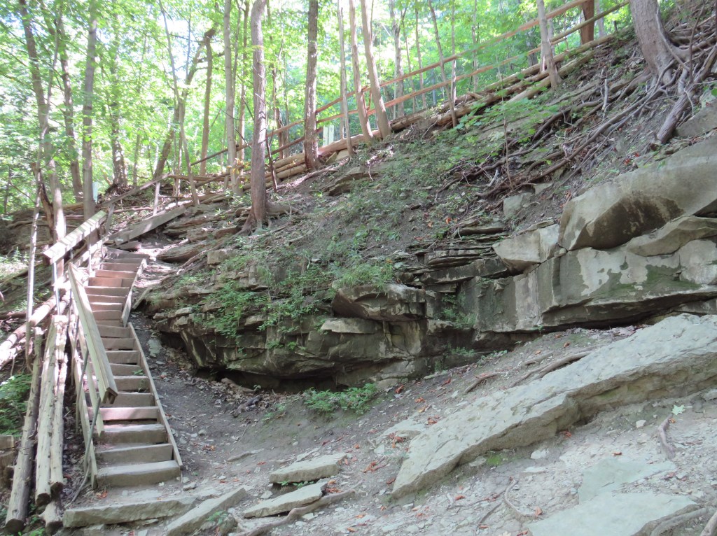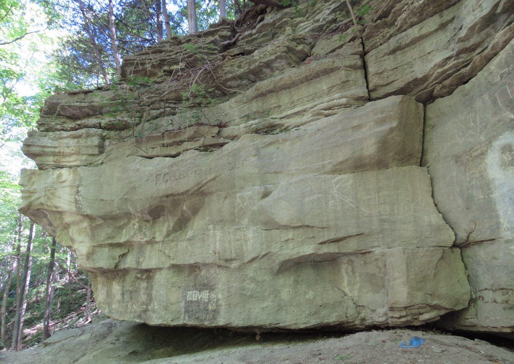 337. The lower two-thirds of this massive overhang right by the trail is of Whirlpool sandstone. The boundary between it and the underlying Queenston shale (see #333 above) marks a massive extinction event in the planet’s history. This took place about 445 million years ago, and forms the transition between the Ordovician and Silurian geological periods. Up to 60% of biological species, almost all of which were sea-dwelling, were wiped out. The cause was possibly an ice age lasting half a million years, followed by intense oxygen depletion when warming took place. It took 5 million years for Earth’s biological diversity to recover.