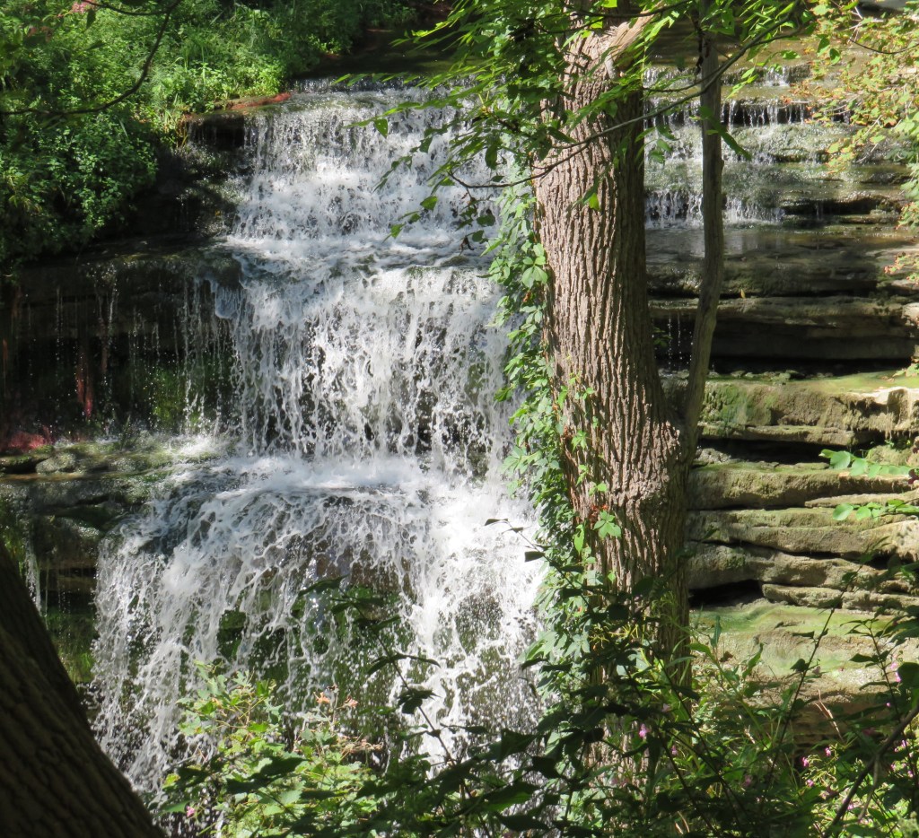339. The last waterfall you’ll encounter on the HOLO loop, the Great Falls of Grindstone Creek at Smokey Hollow, is rather difficult to see fully when the leaves are out. The water power this 10-metre terraced ribbon falls provided was Waterdown’s raison d’être. There were as many as 28 industrial establishments clustered around Smokey Hollow from 1827 until the early 20th century, hence the “smokey.” Few traces of any of them remain. Waterdown’s name itself may derive from the falls: it was where the water of Grindstone Creek went down the Escarpment. However, as Waterdown’s founder (see #341 below) was a Methodist teetotaller, his preference for water over whisky may also have factored into how the village got its name.