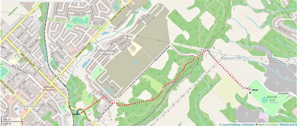 If you have two cars, park the start car in the Smokey Hollow P in the unlikely event that there is room (see #349 below). Otherwise park it in Waterdown Village and walk carefully down Mill Street South facing oncoming traffic to reach the start point. Park your end car in the large free P at Bayview Park on King Road, where you began the loop sixteen hikes ago.