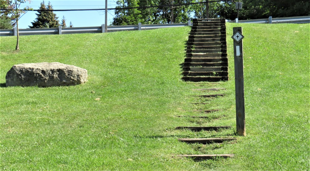 350. Leave the Smokey Hollow P by these steps up to Mill Street South. Cross the road with care!