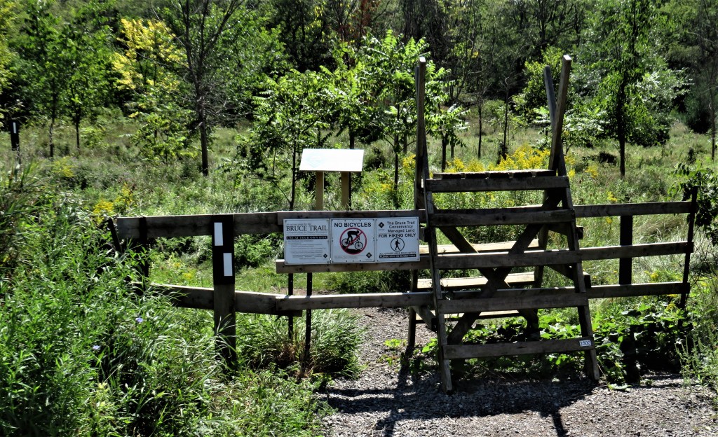 354. You cross Mountain Brow Road and then enter the woods on the edge of the Escarpment via this stile. Stiles are found along the entire length of the Bruce, though there are only two on the HOLO Loop, both on this section of trail. Based on a UK design, a stile is a pair of wooden ladders that enables hikers to climb over a fence (usually one demarcating private property) without damaging it. Where there is livestock, a stile is better than a gate, as it can’t be carelessly left open by hikers. There are no farm animals around here, so this stile is probably to deter cyclists and riders of motorized vehicles. Bicycles and (especially) ATVs are generally banned from the Bruce as they cut up the trail, leaving it a muddy mess.