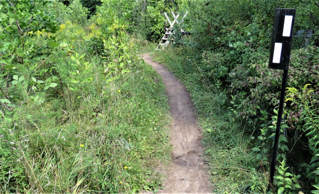 355. This section of trail also includes a less common alternative to a stile: a dodge way. This has two arms projecting each at an angle to a fence, leaving a narrow gap that allows the passage of a hiker but makes it difficult for a wheeled vehicle to pass through. Clearly this section of trail needs to be protected from cyclists.