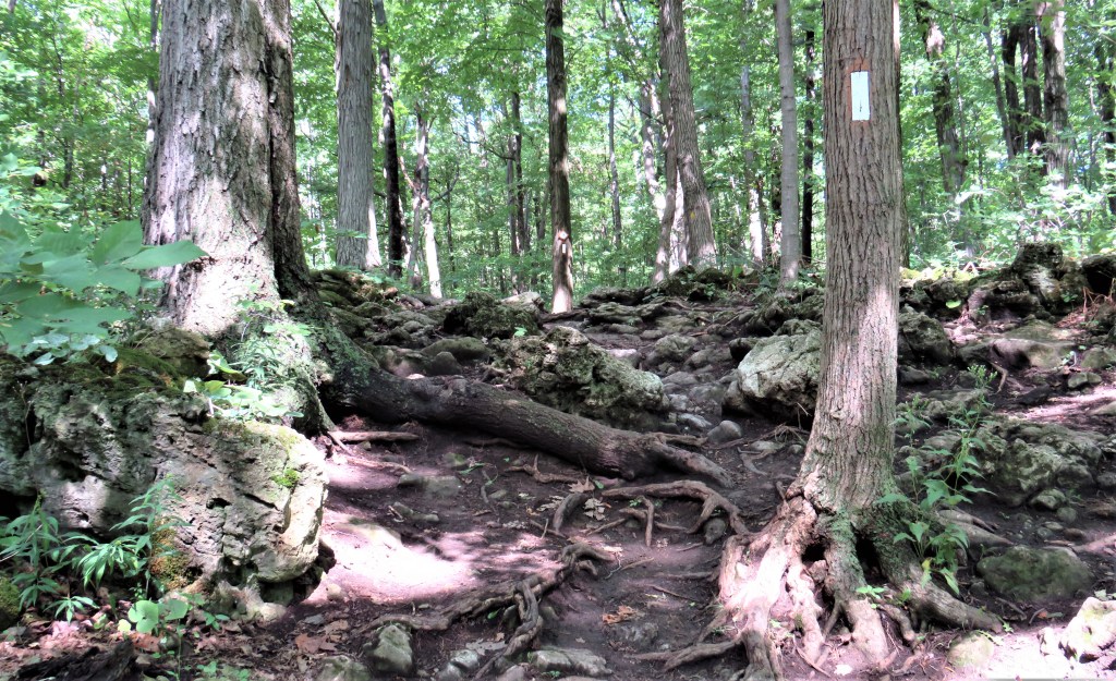 359. Now we’re in a rocky, rooty section near the edge of the Escarpment. J.H. Smith, in his Historical Sketch of the County of Wentworth and The Head of the Lake (1897), recalls: “When the early settlers first came here, rattlesnakes were very plentiful, especially along the escarpment that forms the northern boundary of the Dundas Valley and extends northward through Halton. So numerous were they that it became necessary each returning spring to organize hunting parties to destroy these dangerous neighbors. When the warm spring sun began to awaken slumbering nature, these snakes, aroused from their winter sleep, issued forth from the crevices in the rocks. On the projecting ledges on sunny days they might be seen gathered together in heaps varying in height from one to two feet, and here they lay basking in the sunshine. It was at these times that the hunting parties visited the mountain side, and with muskets loaded with slugs or coarse shot, fired into these piles and destroyed them by hundreds” (p. 25). These days you have to go more than 200 km north to the Bruce Peninsula before you find any rattlers, and even there they are rare and (understandably) shy of humans.