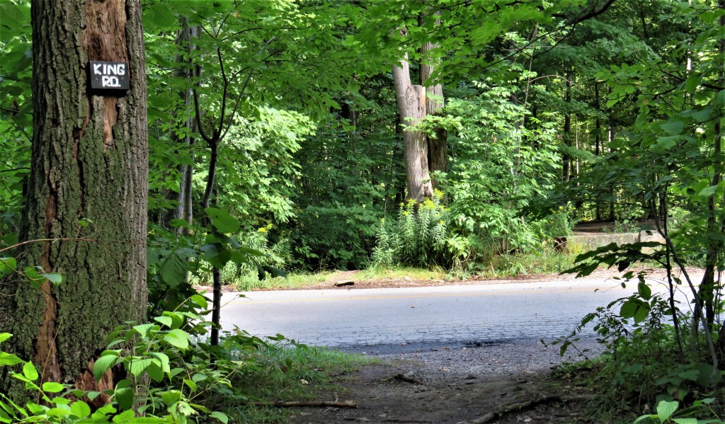 361. This section of King Road is paved but carries very little traffic, now that it is no longer a through road. Neverthless, proceed cautiously downhill as there are no shoulders. The speed limit suggests just how tight the oncoming curve will be. The stickers on the sign indicate that this road is beloved of skateboarders, who can coast from here all the way down into Burlington.
