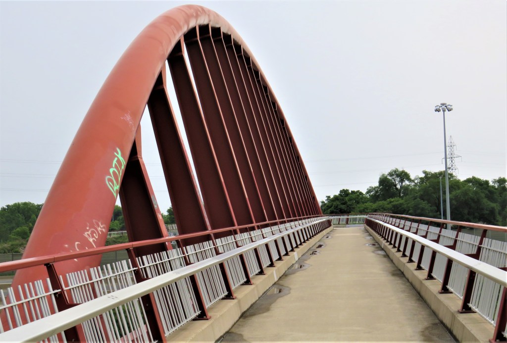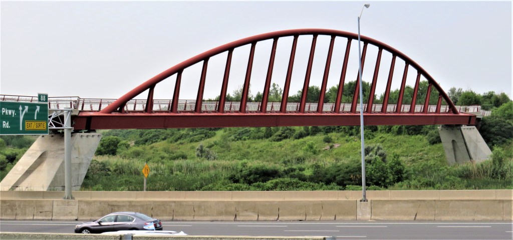61. We join the RHVT near the east end of this bridge, the official name of which is the East Hamilton Waterfront Link. Designed by engineering consultants McCormick Rankin (MRC), it’s 220 metres long with an 80 metre main span (top image) in the form of a single inclined rib steel tied arch. Opened in 2011, it spans Red Hill Creek, its associated wetlands, and the QEW. Reserved for pedestrians and cyclists (bottom), it is the essential link between the Ontario Lakefront and the Bruce Trail system. Without it, this part of the HOLO loop would not have been nearly so neat and appealing. However, one has to remember that access to the Red Hill Valley from the waterfront was blocked not by nature (Red Hill Creek is only a few metres across) but by the hand of man, in the shape of the twelve-lane QEW, while the Red Hill Valley Parkway, opened in 2007, further inhibited access to the Valley from the east. It cost $14,000,000 to remedy this situation. Painted in fireweed red, the same shade as San Francisco’s Golden Gate, the bridge is intended to evoke the red, iron-rich earth of the Red Hill Valley. “It makes a valuable contribution to Hamilton’s public realm, representing a true integration of structure, architecture and landscape coming together to provide a strong sense of place and civic pride,” as MRC put it. Civic pride might have been greater if the bridge had been made here in Steeltown, but, almost incredibly, the steel was fabricated in Japan, assembled 1,856 km away in Dartmouth, Nova Scotia, and then giant pieces of bridge were trucked here with police escorts.