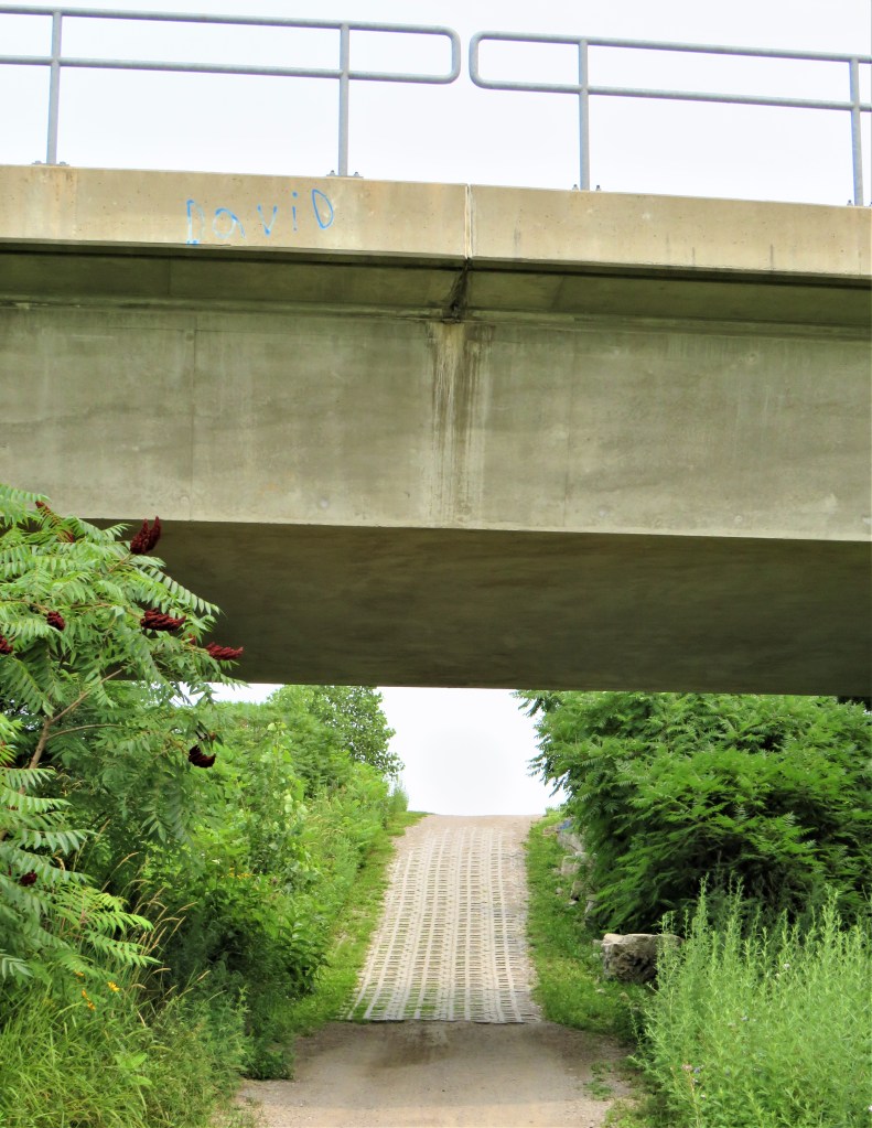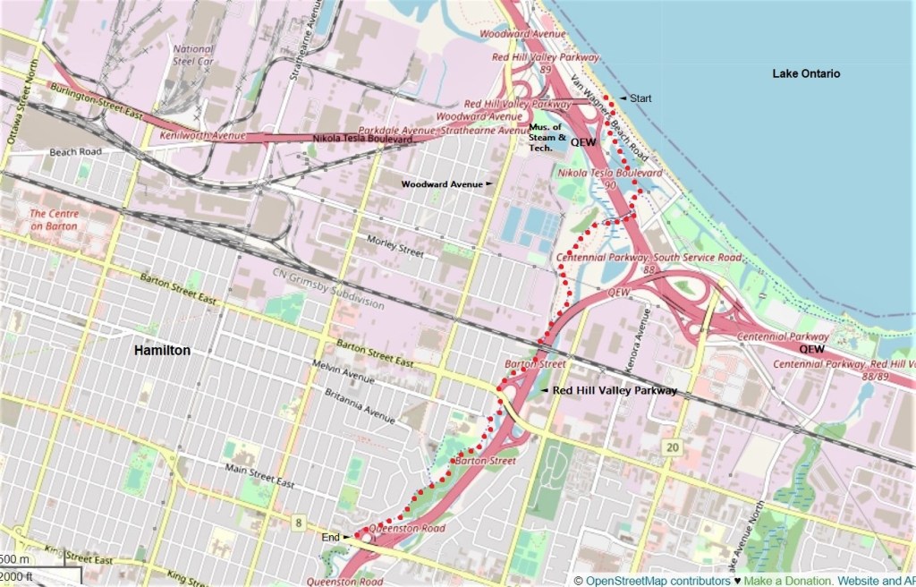 54. This hike takes us from the Waterfront Trail at Hutch’s, over the QEW, and then southwest up the Red Hill Valley Trail (RHVT) as far as Queenston Road (Highway 8). The RHVT follows Red Hill Creek, a small river that descends the Mountain (the Niagara Escarpment), runs through a wooded valley, passes through wetlands on the Harbour side of the Beach Strip, and empties into Windermere Basin in Hamilton Harbour. Once you cross the QEW, the RHVT is always within sound, and often within sight, of the Red Hill Valley Parkway, a freeway connecting the QEW with the Lincoln Alexander Parkway, thus forming the eastern section of the Hamilton ring road. The lower half of the RHVT (i.e., before it starts to ascend the Escarpment) is somewhat similar to the Lower Don Recreation Trail in Toronto: there is heavy traffic often only a few metres away, though in summer it’s usually hidden by vegetation. The main RHVT crosses Red Hill Creek several times and has many junctions with side trails, most of which are not waymarked. So it’s useful to remember that if you’re headed towards the Mountain, you must always keep the Parkway on your left.