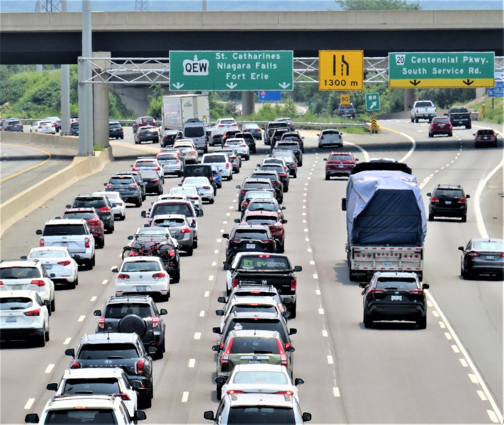 62. The View from the Bridge #1: heavy traffic heads east along the QEW in the direction of Niagara Falls.
