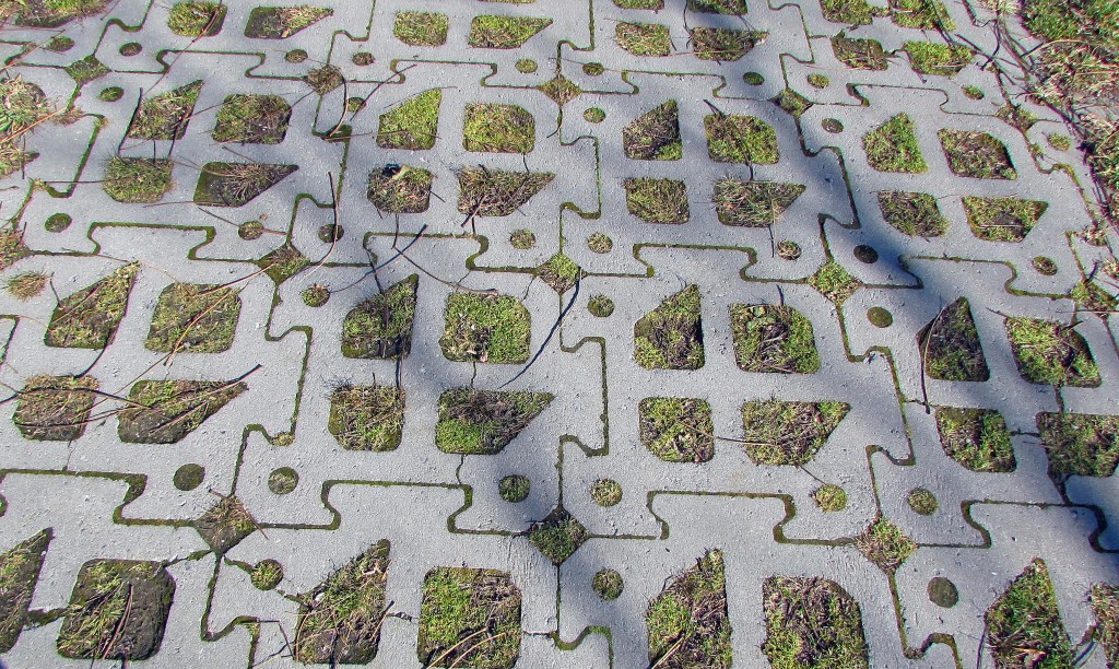 69. (Top image) Some steep sections of the lower RHVT, like this one under a CN rail bridge, are laid with concrete grass-block pavers—a.k.a. grow-through pavers—with (bottom) open cells that allow vegetation to … grow through them. This sort of paving is expensive, but is appropriate in places where it’s necessary to reduce stormwater runoff and recharge groundwater. These sections of the RHVT might otherwise turn into hazardous sheets of ice in wintertime.