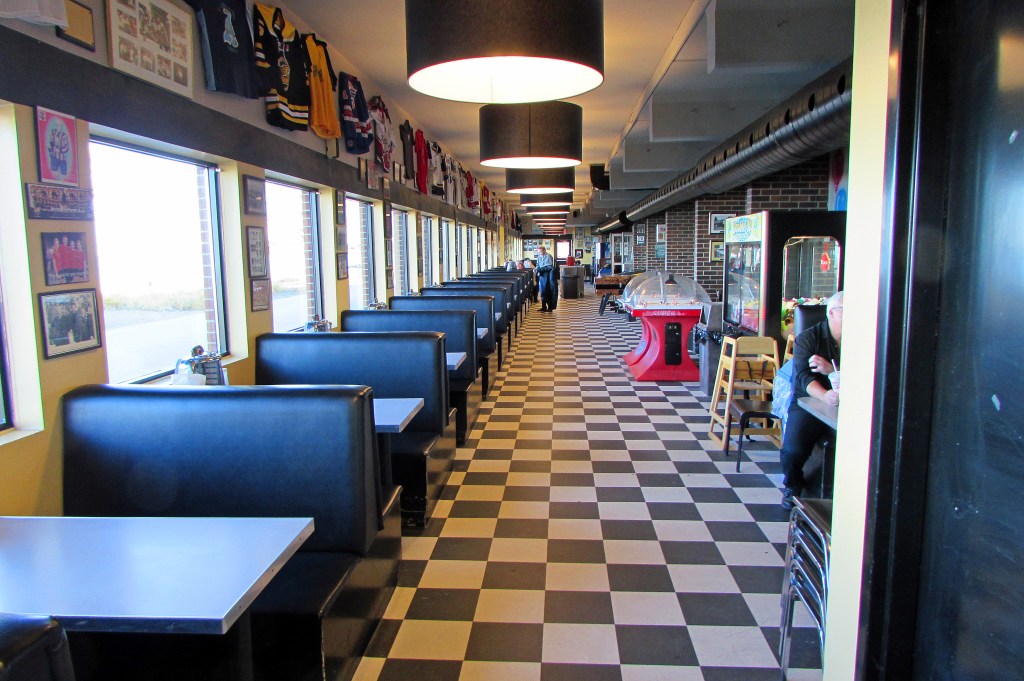 55. Hutch’s was founded by Bill Hutchinson Sr. in 1946 as Hutch’s Dingley Dell. If you didn’t take the opportunity to sample their offerings on the last hike, don’t miss out this time around. Nothing exotic on the menu: they specialize in fish and chips, hamburgers, hot dogs, and ice cream, but what they do, they do well. The Lake side of Hutch’s (top image) is bland and functional, giving little hint of a restaurant devoted to 1950s nostalgia. The interior booths (middle) each has a (non-functioning) mini juke box, there are working pinball and table hockey machines, and the walls are covered with local sports memorabilia. There’s a “Bill Reynolds Memorial Washroom,” a tongue-in-cheek tribute to a local toilet paper salesman. And there are murals on the front of the restaurant by Norman R. Fournier. The original restaurant building, depicted in the mural (bottom), was demolished in the late 1980s and the new location, a converted snack bar and washroom, opened in 1990 a few hundred metres to the west.