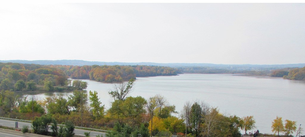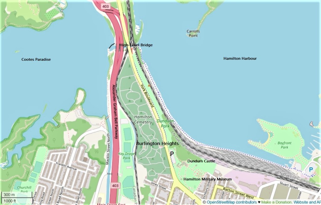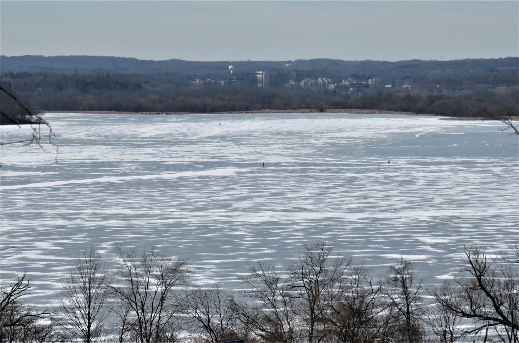 150. At the north end of the Cemetery is a high-level bridge carrying York Boulevard over the Desjardins Canal. The bridge offers spectacular views over Hamilton Harbour to the east, and (especially) over Cootes Paradise to the west (top image), with the town of Dundas just visible at the far end. Unfortunately, busy Highway 403, running close to the shore in the foreground, tends to shatter the illusion of rural calm. (Bottom) During cold winters the shallow waters of Cootes Paradise freeze solidly enough to support a few brave (or foolhardy) skaters.