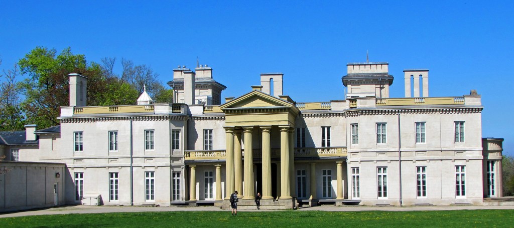 147. Dundurn Castle (top image) is an Italianate neoclassical mansion, the finest domicile of its period in Canada. Built of stucco-covered brick, it was completed in 1835 for Sir Allan Napier MacNab (1798-1862), a prominent figure in early Hamilton history. As a teenager MacNab fought in the War of 1812, and later he had a major role in suppressing the Rebellion of 1837 led by William Lyon Mackenzie. At least in his earlier career, MacNab was a diehard Tory, a supporter of the Family Compact and an opponent of political reform towards responsible government. He made a fortune in land speculation during the rise of Hamilton to prominence at the Head of the Lake, and built Dundurn Castle with the proceeds. From 1854-56 MacNab served as joint premier of the Province of Canada, representing Canada West (i.e., pre-Confederation Ontario). The mansion was bought by the City of Hamilton in about 1900 and has subsequently been restored to its appearance in 1855, i.e., during MacNab’s premiership. Guided tours are available and recommended; (bottom) the drawing room on the main floor.