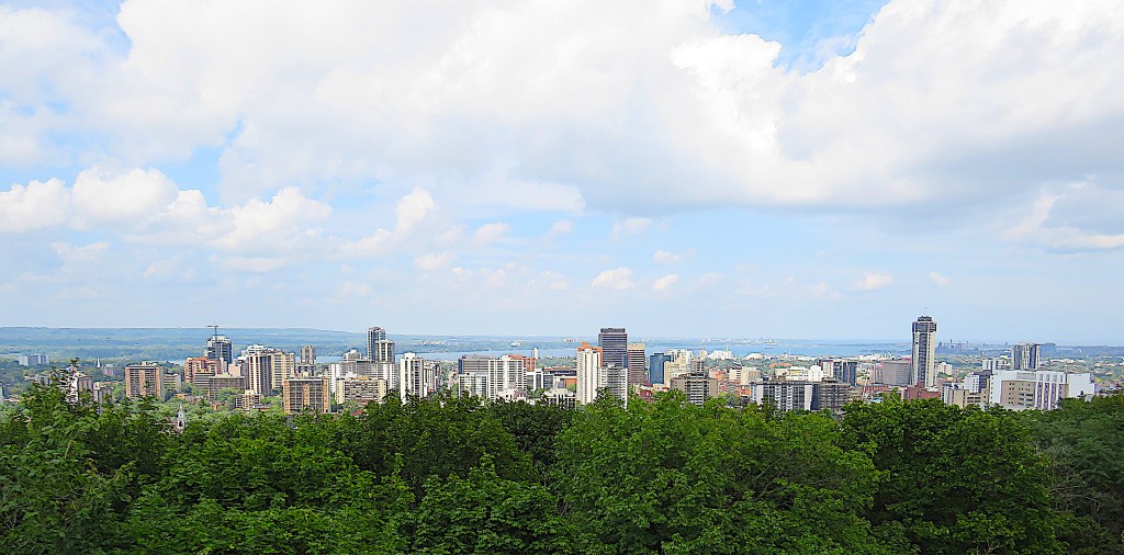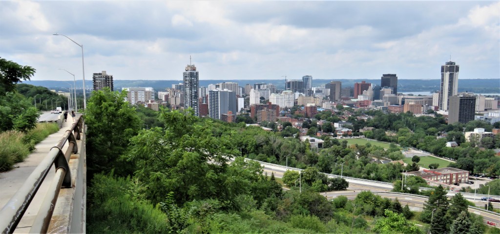 132. The skyline of downtown Hamilton, composed chiefly of residential towers, is reasonably imposing for a city of half a million. The tower on the left is the Olympia Apartments (98 metres, 1976), the fourth tallest in the city, though seemingly taller because of its raised location only a couple of hundred metres from our viewpoint. On the horizon is the wooded slope of the Escarpment after it has made a 180 degree turn around the Head of the Lake and is heading east towards Burlington. That’s our future direction, too.