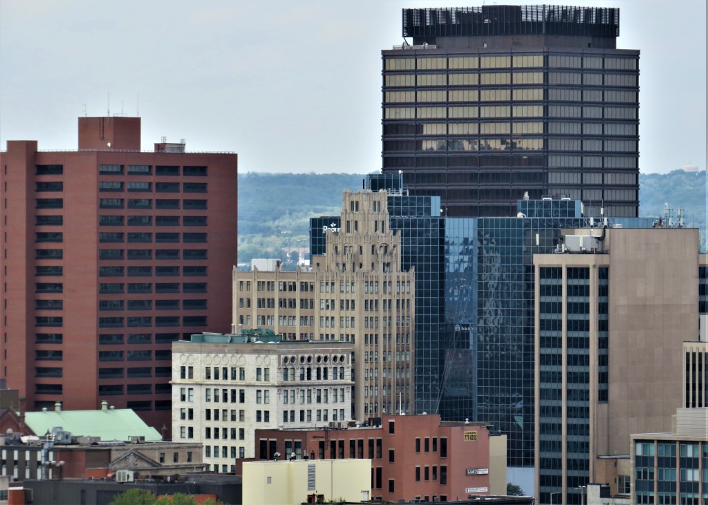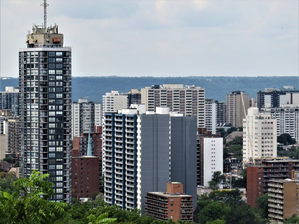 141. A panoramic view of Hamilton’s skyline, with Hamilton Harbour stretching away behind. Hamilton’s tallest building, Landmark Place (127 metres, 1974) is at right. In 2018 a height limit of 94.2 metres was imposed on Hamilton skyscrapers, representing the putative height of the Escarpment in this area. Its intent was presumably to preserve views of the Harbour from the Escarpment. It is currently unclear whether this policy is actually being enforced, as Hamilton’s second tallest and most recent skyscraper, the Marquee Residence at 20/22 George Street (104 metres; the second tower from the left), was completed in 2020.