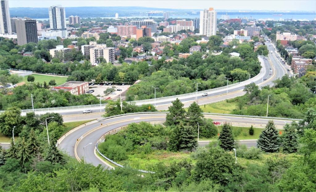 133. To gird themselves for the steep climb up the Mountain, access roads gobble up considerable tracts of real estate. The hairpin in the foreground is on the Sherman Access, the same road that we started on this hike. It normally takes traffic from Charlton and Wentworth Streets to Upper Sherman, but was closed for repair when I passed by, hence the absence of vehicles. Beneath it is the Claremont Access that takes traffic from Victoria Avenue (disappearing toward the Harbour) to Upper James Street, the main north/south drag on the Mountain. The smooth patch of green at left and the parking lot to its right are in Corktown Park, the western end of the Escarpment Rail Trail.