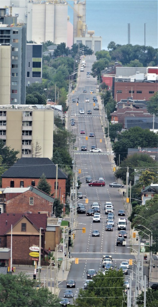 134. This is the view down a 2 km section of Wellington Street from Main Street East (that crosses it at the Tim Hortons sign at bottom left) as far as the grain terminal at Pier 10 on the Harbour. The lower city between the foot of the Escarpment and Burlington Street, the northernmost major east/west thoroughfare, is only about 2.5 km from north to south. Torontonians have a difficult period of mental adjustment when they come to Hamilton: they have to get their heads around the fact that here Lake Ontario lies north, rather than south, of downtown.