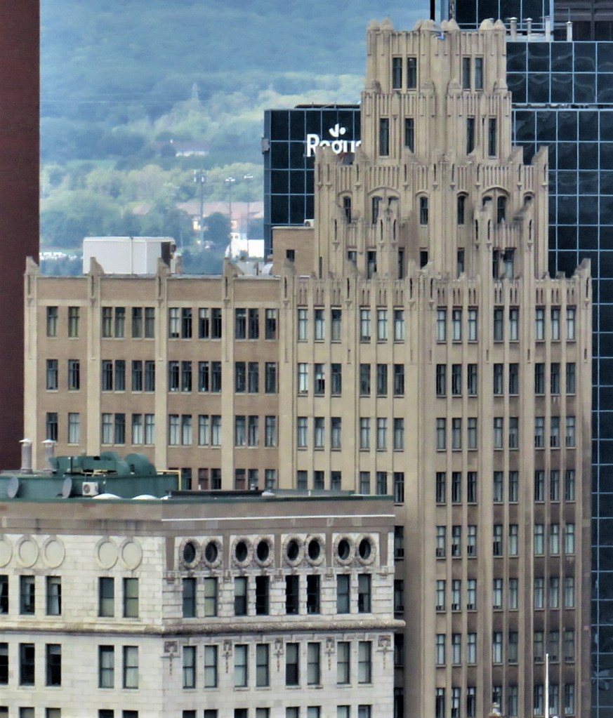136. (Zooming in.) The Art Deco/Gothic Revival Pigott Building at 36 James Street South was Hamilton’s first skyscraper (64 metres, 1928). Designed by Bernard Prack (1881-1962), its stepped-back tower was modelled on the American Radiator Building (1924) in New York City. Originally an office building, in 1996 the Pigott was converted to an upscale condominium with 110 apartments. The Hamilton-based Pigott Construction Company was responsible for many prominent buildings in Hamilton and beyond, including some of the original buildings (1929-30) on the campus of McMaster University, Westdale Secondary School (1931), the Cathedral of Christ the King (1933, see #140 below), and the first Burlington Skyway (1958). In Toronto, Pigott built the first expansion of the Royal Ontario Museum (1933), and the original three buildings of the Toronto Dominion Centre (1967-68).