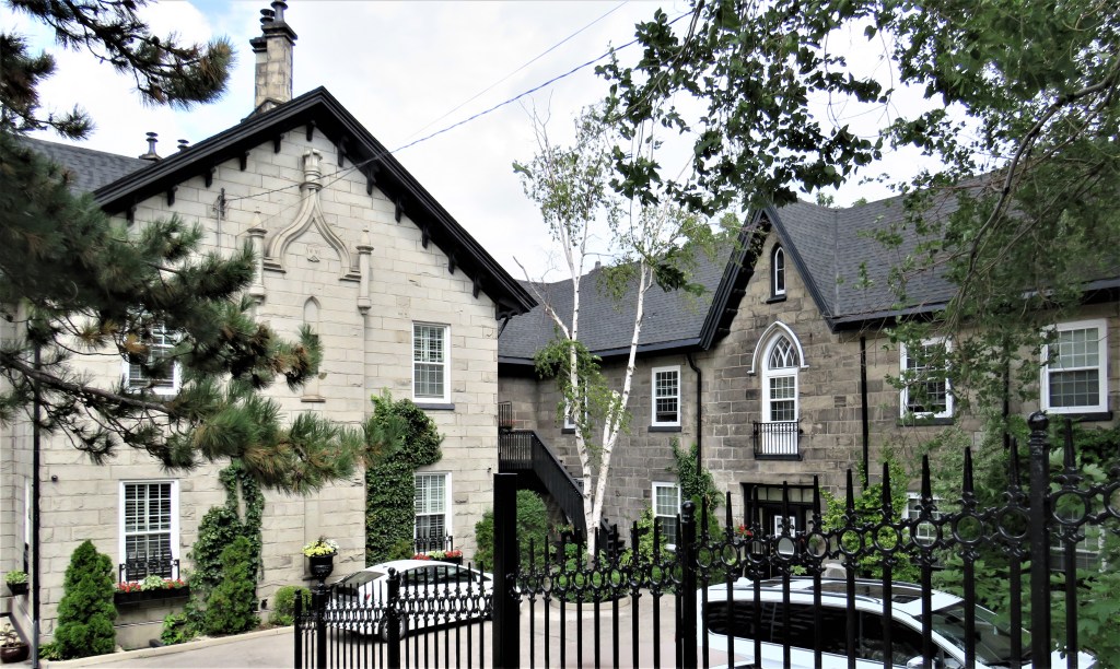 139. Where the Bruce makes a U-turn and dives under Arkledun to join the Claremont Access, sits this charming group of stone buildings. As Rock Castle, it was a thirty-room Picturesque Gothic mansion built in 1848 by the owner of a foundry; it was later renamed Rannoch Lodge, but “Rock Castle” is what has stuck. Now it’s squeezed between a tower block next door and a steep drop-off. It has survived because the insurance company who bought the land it stands on in 1969 was allowed a zoning concession in return for donating the building to the City of Hamilton. As 95 Arkledun Avenue, Rock Castle is now a private residence as well as a small number of separate apartments.