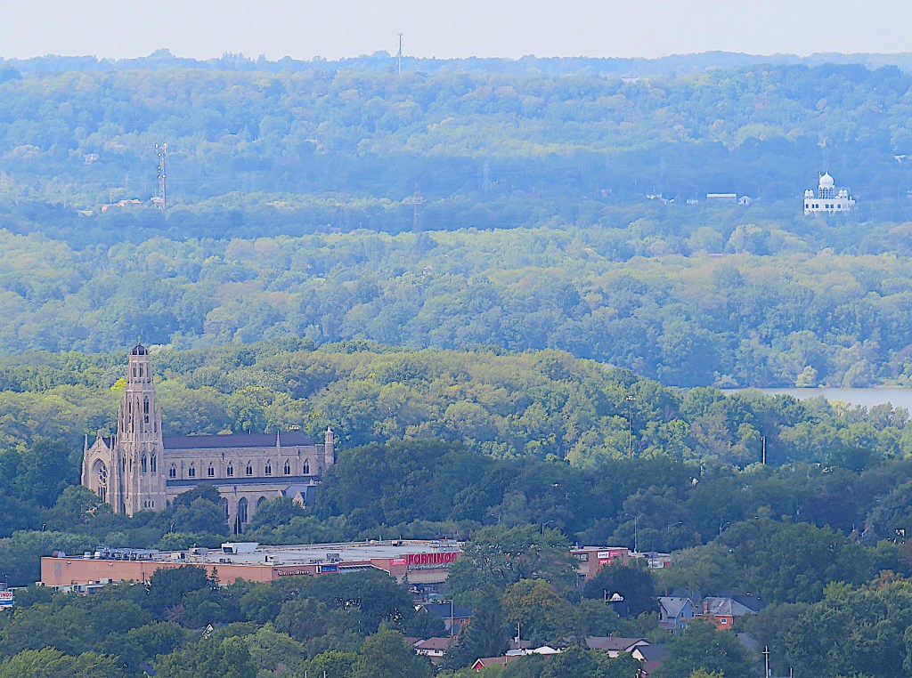 140. As the Trail climbs alongside the Claremont Access, the mouth of the wooded Dundas Valley comes into view. The edifice at left is the Cathedral Basilica of Christ the King, seat of the Roman Catholic Diocese of Hamilton. It was designed by the Hamilton architect William Russell Souter (1893-1971) and built by the Pigott Construction Company (see #136 above). A sliver of Cootes Paradise can be seen at centre right. The white domed building at upper right is a Sikh temple, the Gurdwara Shaheedgarh Sahib (1974) on Old Guelph Road in Dundas. Two very different religious traditions have taken advantage of the unusual topography here at the Head of the Lake. They have built their temples on prominences away from the urban centre in order to capitalize on the mystique provided by distant views.