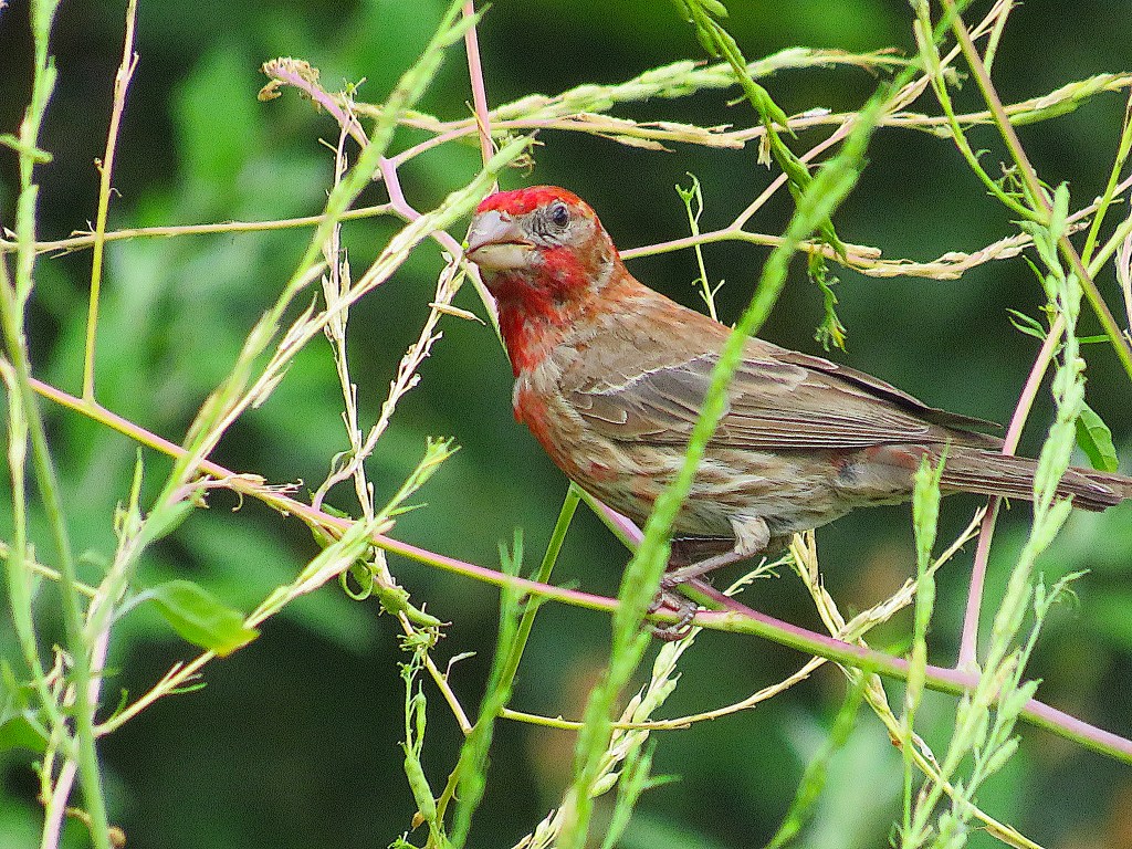 142. This bird was perched in a bush by stairs leading down from James Mountain Road. It was quite aware of my presence, but was curious enough to stick around long enough for me to photograph it. It’s an adult male house finch (Haemorhous mexicanus), with a huge bill for its size and a head seemingly dipped in red ink. These birds were natives of southwestern North America, but were marketed to New York City pet stores as “Hollywood finches” in the early 1940s. As they were wild birds, their sale was then banned by the Migratory Bird Treaty Act (see #115 above), so the pet dealers simply released them to avoid prosecution. They were first spotted in Ontario in 1972 and since then have done a fine job of colonizing the entire province. They are one of the few birds that can outcompete the house sparrow at bird feeders.
