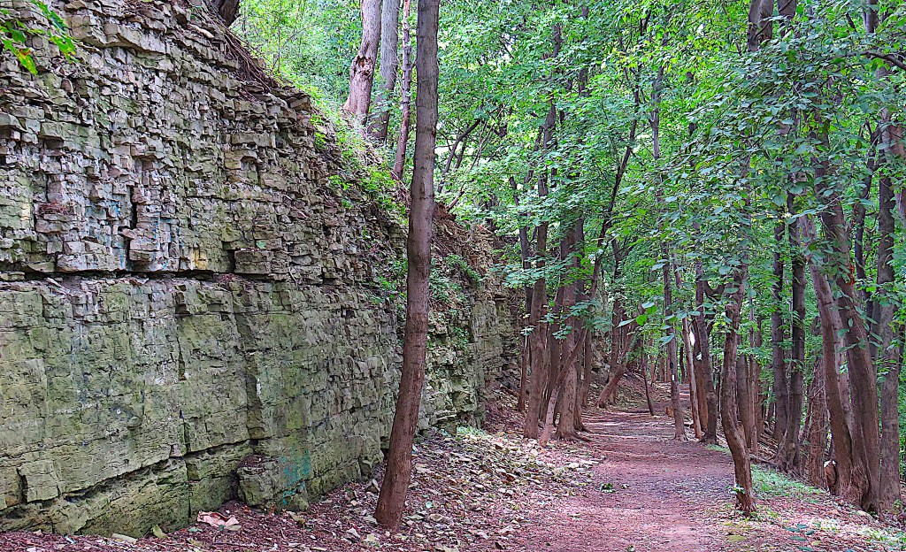 143. Here exposed strata at the top of the Escarpment form a wall that runs alongside the Bruce Trail as it descends from James Mountain Road to Beckett Drive.