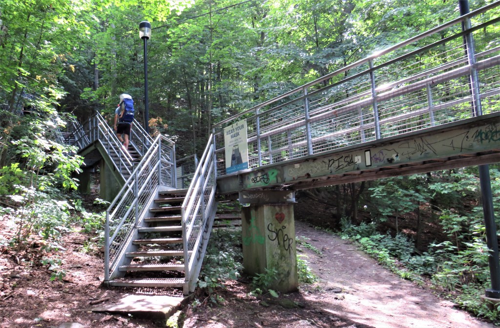 129. Today’s linear hike is 4.0 km from its start at the intersection of the Bruce/Escarpment Rail Trail and Wentworth Stairs, to its end where the Bruce Trail meets Dundurn Stairs. If you bring two cars, you’ll park one at your previous end point at the P in Mountain Avenue Park at the top of Wentworth Stairs, and the other on Dundurn Street close to the Hillcrest bus loop by the foot of Dundurn Stairs. You’ll go halfway down Wentworth Stairs (much easier than climbing them!) until you hit the Bruce, which runs along the side of Sherman Access for a short way before veering into the woods. At the end, you meet Dundurn Stairs halfway up and go down them to your end car. Unless you fancy walking through Hamilton suburbia and reclimbing the whole height of Wentworth Stairs, there is no recommended return route on this hike.