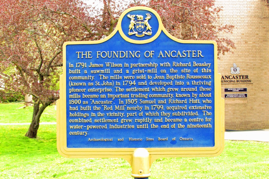 186. Ancaster got its name indirectly from a village in Lincolnshire, England. The Township of Ancaster was created by Upper Canada’s Lieutenant Governor Simcoe in 1792, who (probably) named it for Sir Peregrine Bertie, 3rd Duke of Ancaster and Kesteven (1714-78), a notable British general of the mid-18th century who had no Canadian connection. The Township was an inverted triangle with Governors Road as its northern edge and its southern point near Carluke. The settlement first known as Wilson’s Mills was the largest in the Township, and took the name “Ancaster” for itself in about 1800. Ancaster considers itself the third oldest settlement in Ontario, after Kingston and Niagara-on-the-Lake. Using the water power of Ancaster Creek over the edge of the Escarpment, it became a successful early industrial centre, and in the early 1820s may have had the second largest population in Upper Canada after Kingston. But thereafter, steam technology, canals, and railways gave nearby towns below the Escarpment (first Dundas, then Hamilton) an advantage. Thereafter Ancaster grew very slowly, and did not gain the status of a town until 1974. Recently, however, its population as a bedroom suburb of amalgamated Hamilton has soared to more than 40,000.