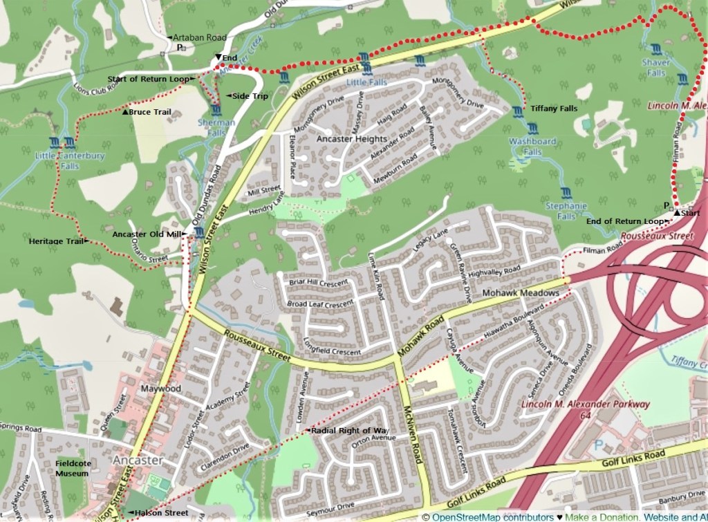 *plus 400 metres to P on Artaban Road; plus 850 metres side trip to Tiffany Falls; plus 5.7 km return loop via Ancaster Village.