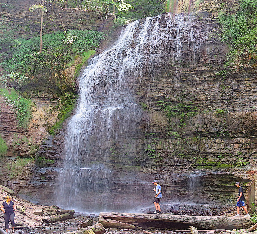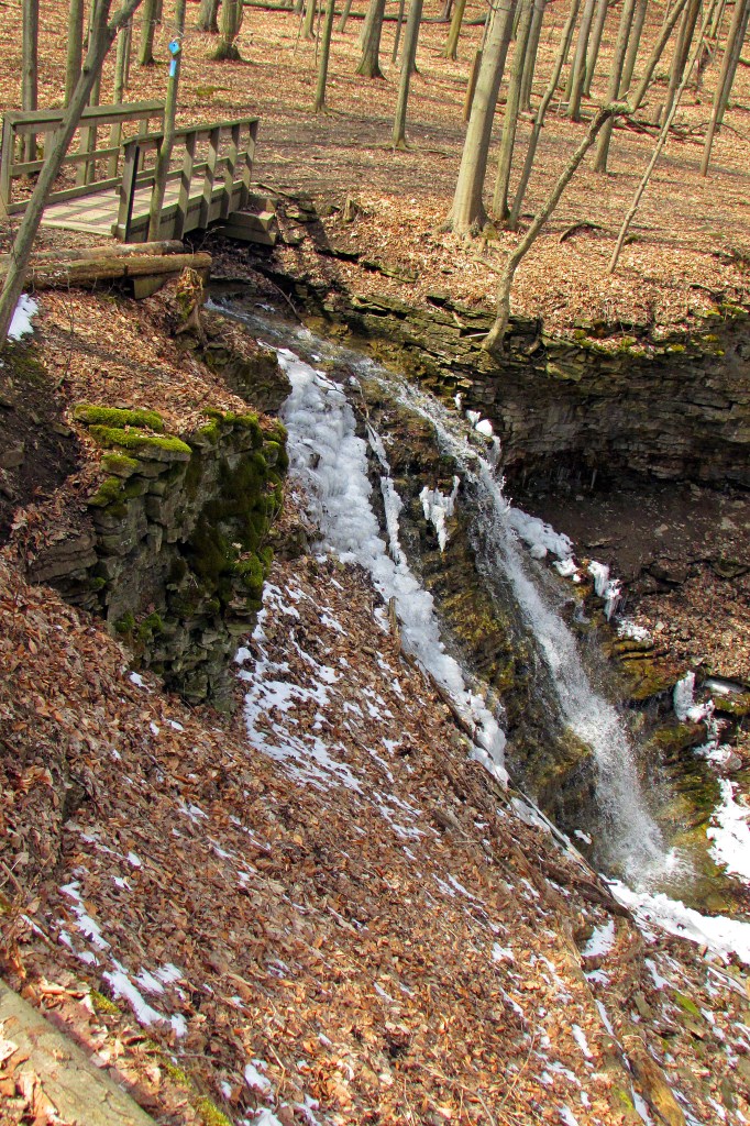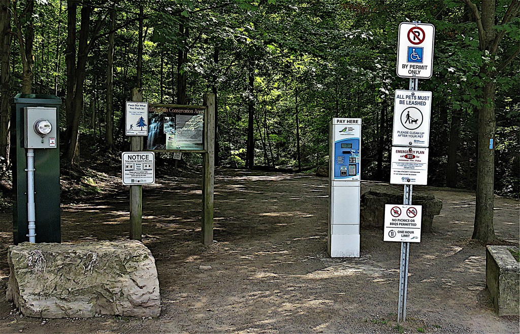 171. Today’s linear hike, represented by the larger red dots on the map above, is a short 2.9 km, though with some challenging up-and-down sections. You park your start car at the previous hike’s end point on Filman Road, and your end car at the P on Artaban Road (first right off Lion’s Club Road). Mid-hike, there’s an unmissable 850 metre side trip to Tiffany Falls, spectacular after rain or during spring runoff. At the end of the hike on Old Dundas Road you’ll walk an extra 400 metres to your end car. Close to the end car is another major waterfall, Sherman Falls, though you might want to leave this 800 metre side trip for the next hike. The end of this hike is in the Dundas Valley Conservation Area (DVCA), and parking here is restricted to official lots: you should not park by the side of the road anywhere in the DVCA. Unless you are a member of Hamilton Conservation Authority and display your membership card on your dash, you’ll probably have to pay to park in the DVCA.