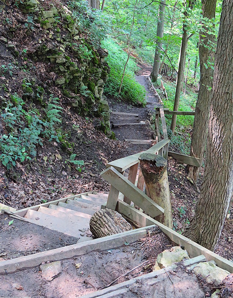176. This part of the hike has steep sections both up and down. These are typical Bruce Trail rustic stairs, all of which have been constructed by volunteers. Watch your step, especially if the trail is slippery with mud.