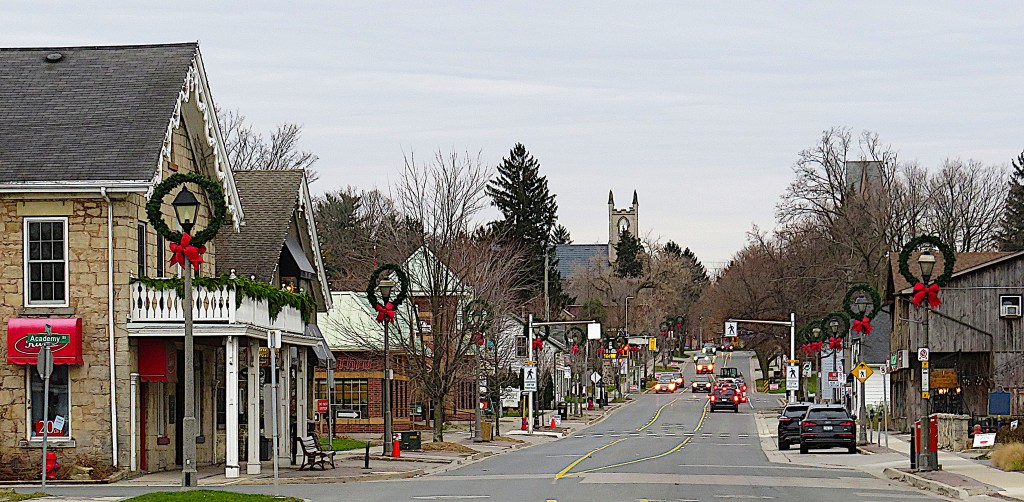 185. Looking southeast along Wilson Street East, we find Ancaster Village in festive regalia. The tower of St. John’s Anglican Church gives the scene its classic villagey focus. However, the sidewalks here rarely bustle: Ancastrians go to Meadowlands, the big-box area 3 km to the east of here, to do their serious shopping.