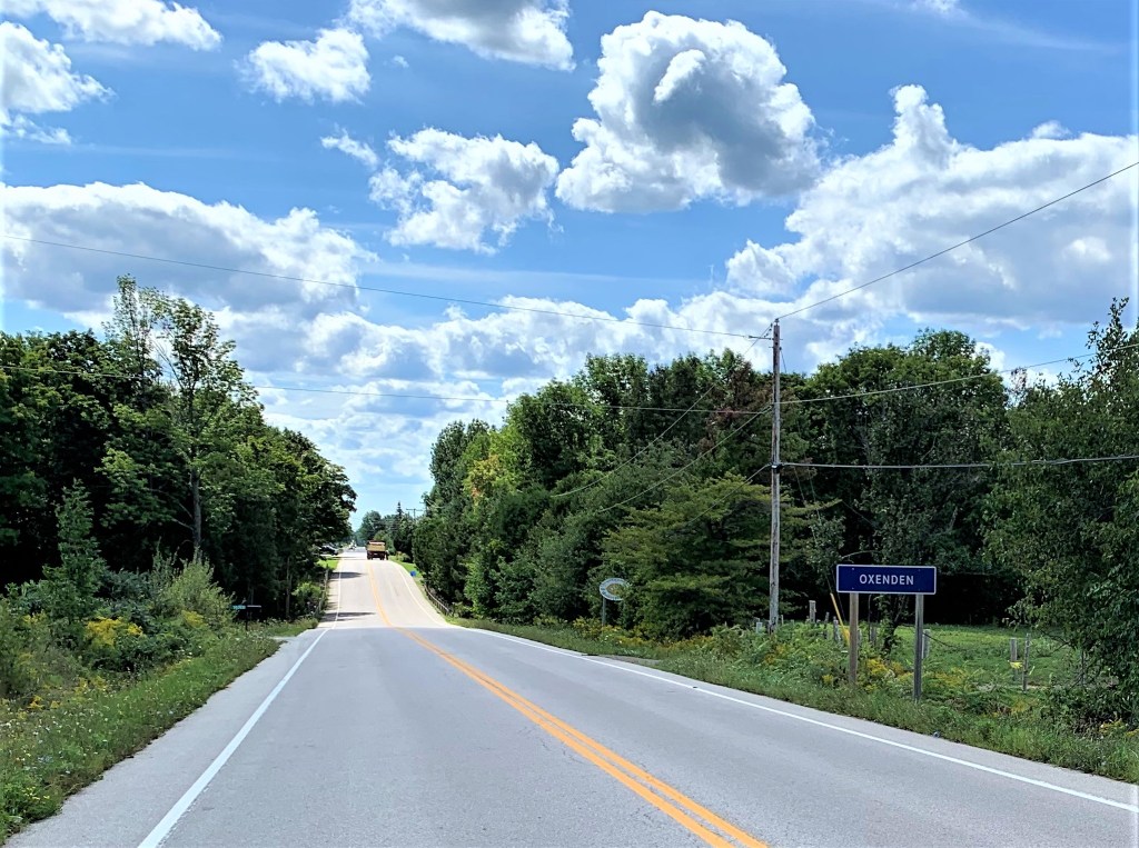 722. Down from the Bluff, we walk along Grey Road 1 into Oxenden. This village was founded in 1862 and named for the Anglican Bishop of Montreal, Ashton Oxenden (1808-92), who by virtue of his position was also Metropolitan Bishop of the entire ecclesiastical province of Canada. (In spite of the fact that the vast majority of the population of Montreal was Roman Catholic, there was, and is, an Anglican cathedral in the city.) Oxenden was the author of numerous tracts explaining religious doctrine to poor “cottagers” in simple language. Some of these tracts sold hundreds of thousands of copies. Oxenden also wrote the autobiography My First Year in Canada (1871), which paints a vivid portrait of Montreal in 1869-70.