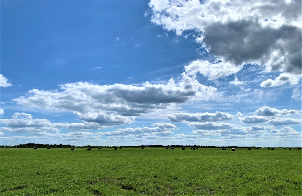 726. Off the road again, we find ourselves on the edge of a huge expanse of plain. Mike and I might be back on the Prairies again, in the Land of Living Skies …