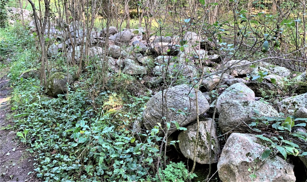 731. An old wall of rounded rocks alongside the Trail brings Robert Frost to mind again. Here’s the opening of his poem “Mending Wall” (1914):