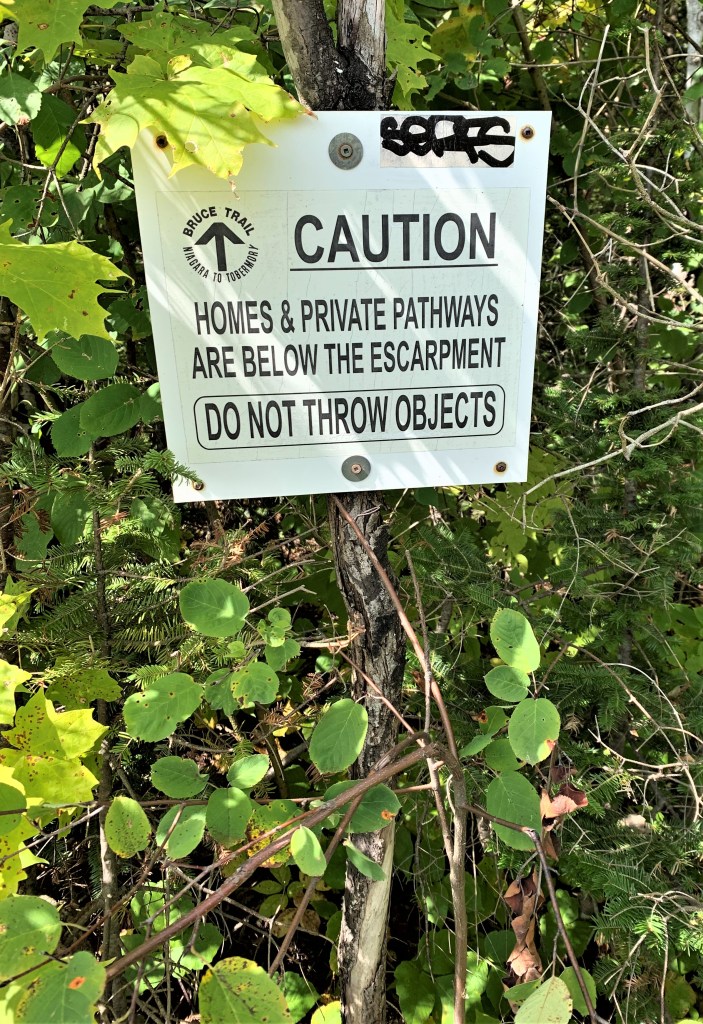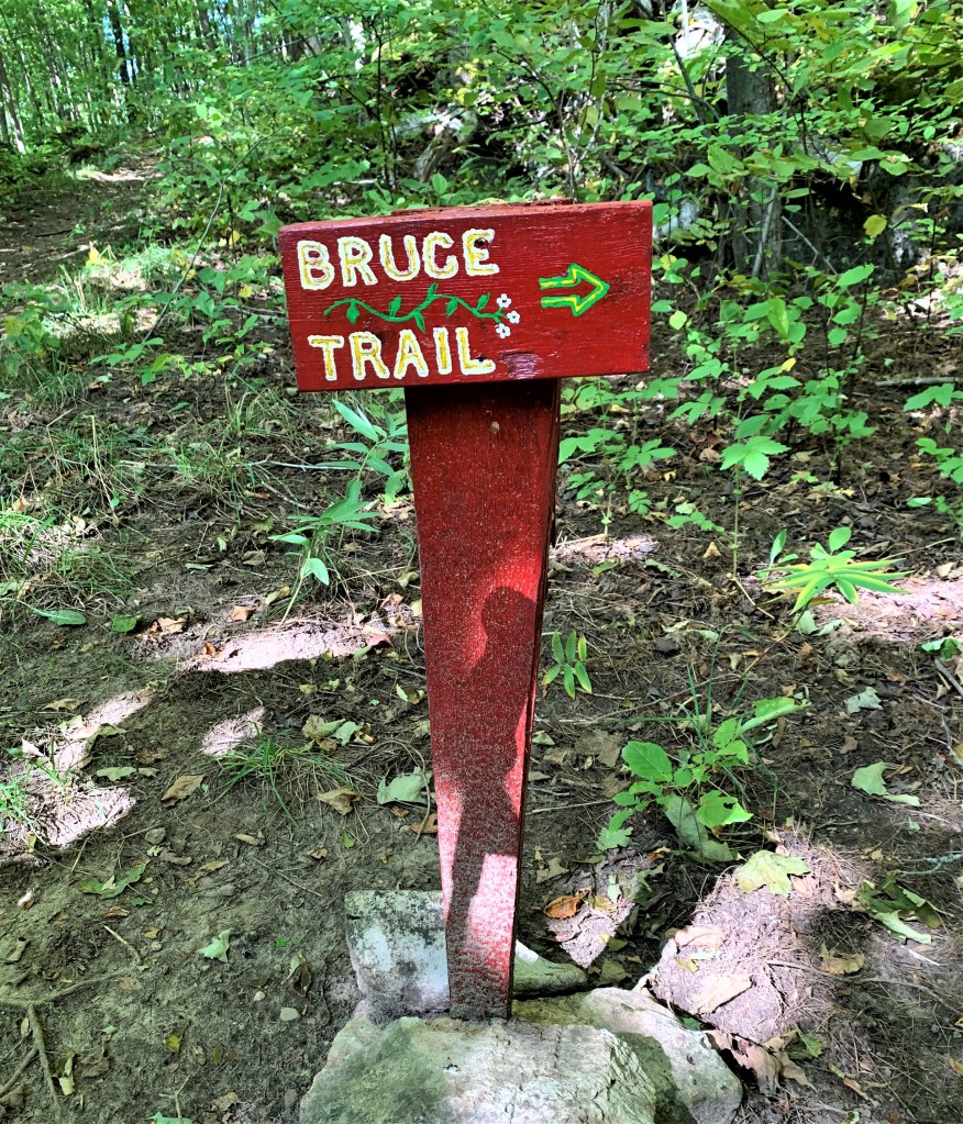 769. An unofficial but cute hand-painted sign guides hikers up the Escarpment from Hope Bay. And it reminds me that I haven’t yet accounted for the “Bruce” in the name of the County, nor of the Peninsula, nor of the Trail itself. Alan Rayburn in Place Names of Ontario notes that Bruce County was named for James Bruce (1811-63), 8th Earl of Elgin and 12th Earl of Kincardine, during whose term (1847-54) as Governor General “responsible government was introduced” into what was then the Province of Canada (p. 46). That is, Lord Elgin distanced himself from politics and so began the tradition that the Governor General should play chiefly a symbolic role in the nation’s affairs. (It was Elgin’s father, the 7th Earl, who was controversially responsible for shipping the Parthenon sculptures known as the Elgin Marbles to the British Museum.) The Bruce Peninsula was referred to by early white settlers as the Saugeen, or Indian Peninsula, but as the native population was forced into smaller and smaller areas by colonial settlement, it came to be known by the name of the County. As for the Bruce Trail, The Bruce Beckons: The Story of Lake Huron’s Great Peninsula (1952) by the classical scholar William Sherwood Fox had a large part to play. This book “described the flora, fauna, and physical beauty of the Bruce Peninsula in such a lyrical and compelling fashion that the Bruce became a mecca for naturalists” (David E. Tyson, Trail to the Bruce, p. 25). So the Bruce Trail was named indirectly for a Scottish nobleman and directly for the Peninsula that served as its dramatic climax, and Bruce Trail was preferred to alternatives (as Tyson notes) because the phrase “was nice and short and would fit easily on signs” (like the one above). [Addition 30 March 2021: The sign above was painted by local resident Laura Browne to help Bruce hikers, too many of whom were missing the turn indicated. Thanks, Laura!]